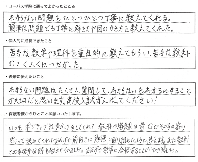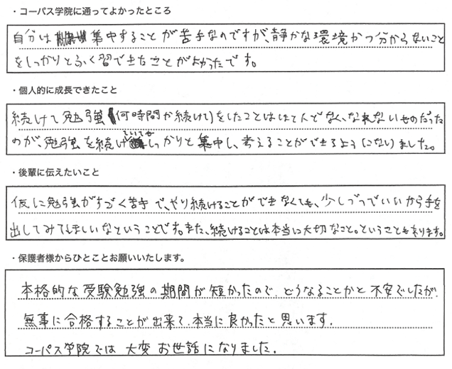 人生の中で受験は通過点の一つに過ぎませんが、大きな試練の一つでもあります。子供から大人へと成長しようと「脱皮」している彼らに手助けしてあげたいと考えています。